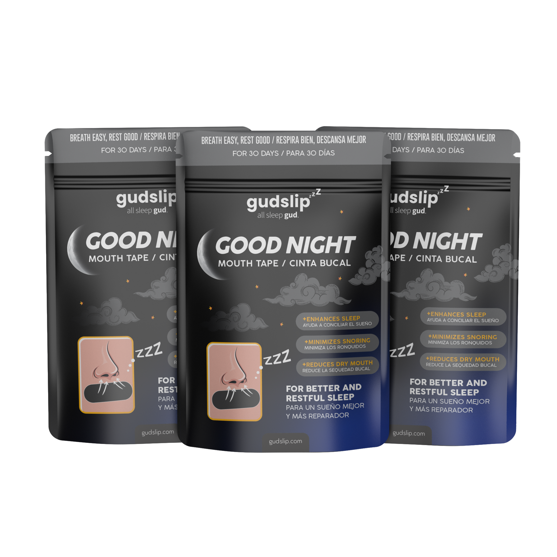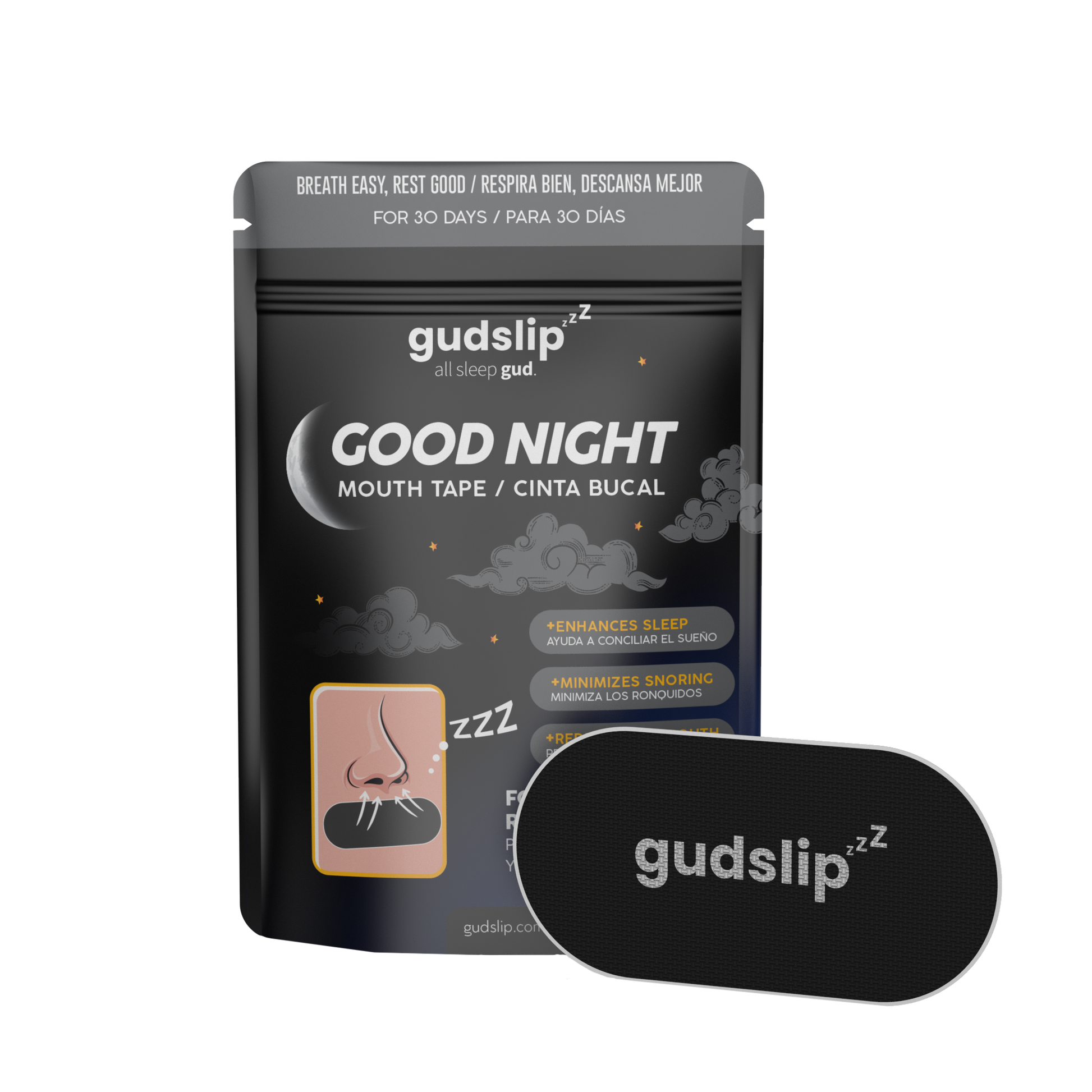 La cinta bucal Gudslip® está diseñada para ayudar a los usuarios a reducir los ronquidos y mejorar la calidad del sueño al promover la respiración nasal durante el sueño.