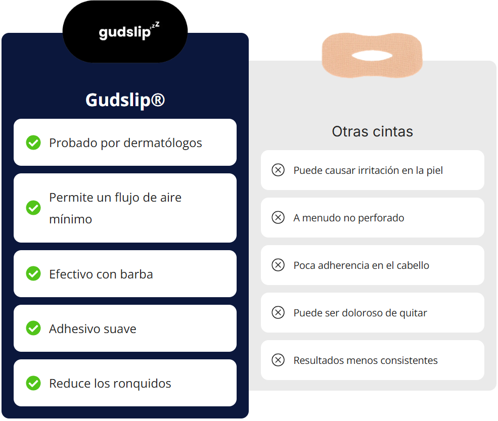 Las cintas bucales Gudslip® ayudan a mantener la boca cerrada de forma segura y cómoda, promoviendo la respiración nasal natural. De esta manera, consigues un sueño más profundo, reparador y con mayor impacto en tu rendimiento físico.